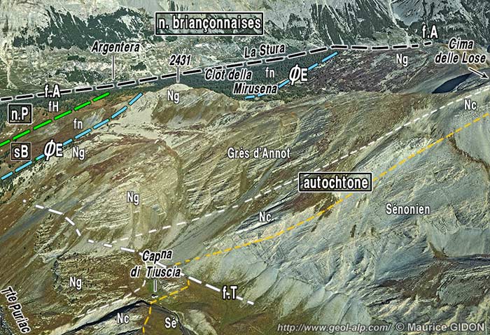 f.Ar = faille d'Argentera ; n.P = nappe du Parpaillon ; sB = lame de matériel subbriançonnais (flysch noir surtout) ; ØE : surface de chevauchement des nappes de l'Embrunais ; f.T = faille (mineure) de Tiuscia.