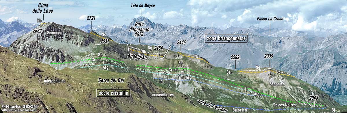 Le vallon de Ferrière suit pratiquement, en amont de ce village, la limite entre socle cristallin et couverture autochtone. Sa rive septentrionale donne une excellente coupe de cette couverture sédimentaire, qui se caractérise par le développement prédominant des calcaires clairs lités du Sénonien. Les termes antérieurs sont biseautés sous la surface de discordance du Sénonien et ce dernier repose directement sur le Trias lorsque l'on atteint le pied des pentes de rive droite de la Stura (voir la page "Bersezio").