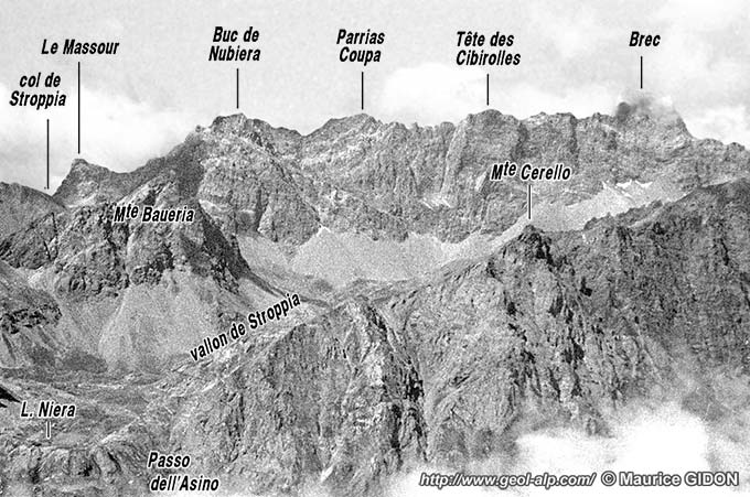 Il passe donc manifestement là une cassure orientée NW-SE, la faille de Stroppia, dont le tracé doit suivre à peu près le lit du torrent jusqu'au Lago Niera mais reste masqué sous les formations quaternaires. Plus en aval il semble que son tracé détermine l'escarpement plus accentué qui traverse en oblique les falaises inférieures de La Rocca Bianca, au sud des cascades de Stroppia par lesquelles le torrent franchit le puissant épaulement glaciaire qui sépare le vallon suspendu de la valle del Maurin (voir ci-après : B/).