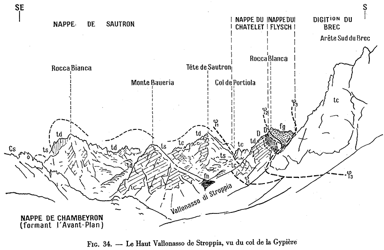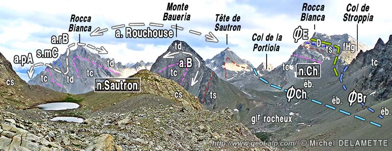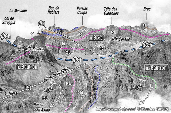 En définitive la transversale de Stroppia est une coupe-clé pour la compréhension de la structure du massif de Chambeyron et surtout de son prolongement vers le SE, en rive droite de la Maira. En effet elle est presque la seule** à démontrer qu'il y avait originellement continuité entre la partie horizontale et celle sub-verticale des nappes empilées : en effet on y voit, de façon indubitable et démonstrative, la charnière anticlinale, dessinée ici par la nappe de Sautron, qui les raccorde.