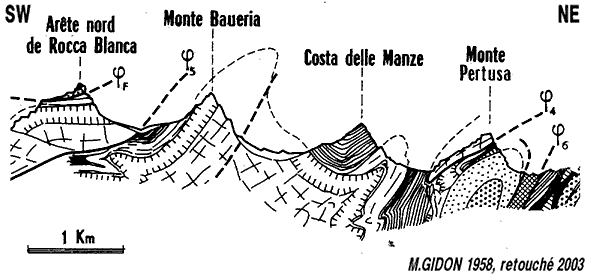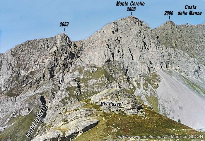 **Les rares autres coupes naturelles montrant cette disposition sont, plus au SE, celle des crêtes des sources de l'Unerzio qui concerne, quant à elle, les nappes (moins élevées dans l'édifice) du Rouchouse et de Rocca Peroni et, plus au NW, celle des gorges du Cristillan qui coupe le nappes (plus élevées) d'Assan et du Guil. |