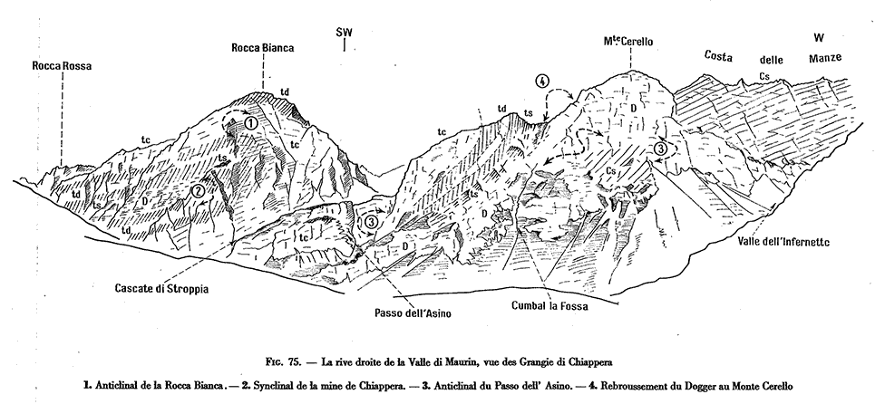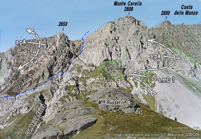 Détail de la face est du Monte Cerello, vue de l'est depuis l'épaulement au sud de la Grange Nicolina. La butte du Monte Russet est surchargée d'un voile gris car elle se profile devant la valle del Maurin et masque largement le pied des escarpements de sa rive opposée. a.pA = anticlinal du Passo dell'Asino ; s.mC = synclinal pouvant représenter le prolongement de celui de la Mine de Chiapera du versant est de la Rocca Bianca (voir la page "Sautron") |