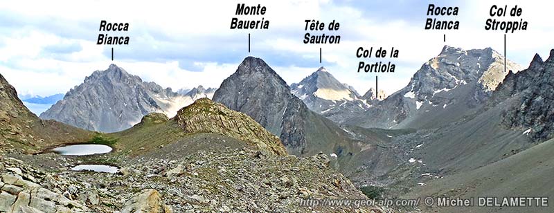 A/ Le Vallonaso de Stroppia est un haut vallon pierreux ouvert au pied des abrupts constitués par les calcaires triasiques des falaises du Brec de Chambeyron. Il se temine du côté est par l'important épaulement glaciaire des cascades de Stroppia, de sorte qu'il est suspendu au dessus des abrupts de la rive droite (occidentale) de la Valle del Maurin. Il communique avec le versant français au nord par le col de la Gypière qui débouche sur les lacs de Chambeyron et au sud-ouest par le col de Stroppia qui débouche sur le vallon de Plate Lombarde en amont de Fouillouse.