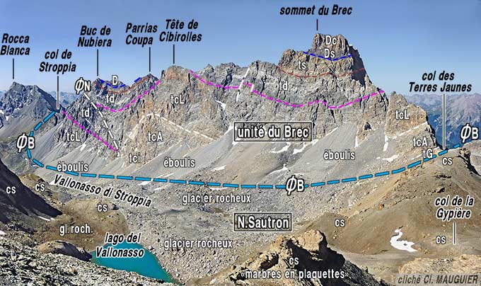 ![]() d'après une image extraite de "google-earth" Le versant oriental de la crête frontière, à la latitude de la haute Valle del Maurin, vu de l'est (le sommet du Brec de Chambeyron sort des limites supérieures de l'image). ØCh = surface de chevauchement de la nappe du Châtelet (unité du Brec) ; f.H = surface de chevauchement des flyschs de l'Embrunais ; f.St = faille des cascades de Stroppia ; a.pA = anticlinal du Pas de l'Ane ; f.Ce = faille du Monte Cerello ; ac.i = accident de l'Infernetto : limite entre nappes de Sautron et de l'Aiguille de Chambeyron (n.aC) ; u.Marinet = unité de Marinet proprement dite ; ØaM = surface de chevauchement (renversée) de l'unité des andésites de Marinet (= "de Mary") ; f.B = faille de La Barge (prolongement méridional vraisemblable) ; f.CC = faille de Ceillac M+cs = marbres versicolores du Malm et du Crétacé supérieur (voir la page Maurin) . |