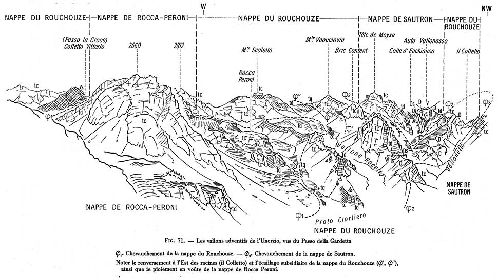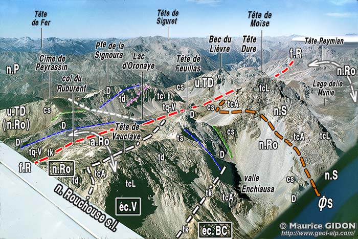 En outre il s'y produit, inversement, un laminage du matériel calcaire de la nappe du Rouchouse, qui disparaît de façon presque définitive plus au SE (voir la page "Gardetta"). Ce sectionnement oblique à la pile des couches, qui apparaît lié au fait que l'on se déplace vers le NE en leur sein, a été considéré comme une géométrie indiquant que l'on se rapproche, dans cette direction, de la "racine*" de détachement de ces nappes.