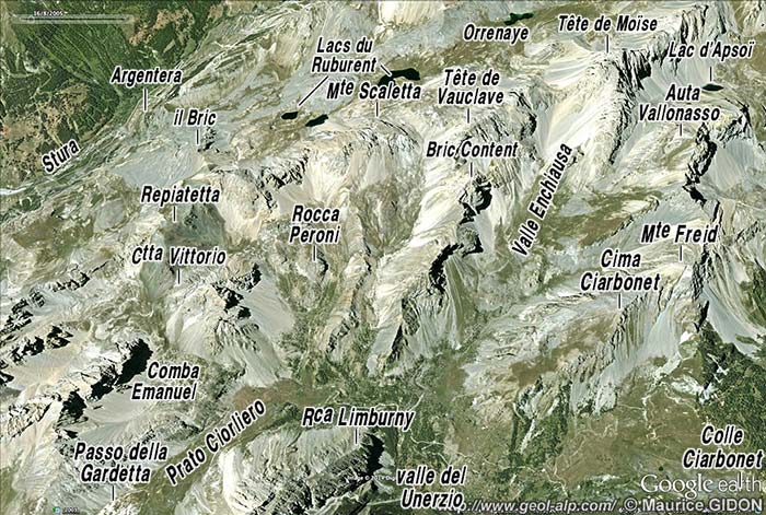 Il est assez clair que la succession calcaire triasico-jurassique de la nappe de Sautron y traverse la vallée pour se poursuivre en rive droite par l'arête du Bric Cassin (voir la page "Cassorso") ; celle de la nappe du Rouchouse forme du côté ouest les deux crêtes encadrant le Vallone Roccetta (Bric Content et Costa Denti). Par contre, immédiatement plus au SE, le matériel constitutif des deux nappes subit des modifications notables : on voit en effet s'intercaler là, entre les bandes de calcaires triasico-jurassiques des nappes ployées en anticlinal, des terrains siliceux permo-triasiques.