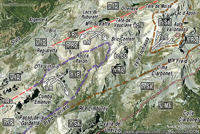 ; s.E = synclinal d'Enchiausa ; n.rP = nappe de Rocca Peroni ; n.Ro = nappe du Rouchouse (u.tD = unité de Tête Dure, éc.V = écaille de Vauclave, éc.bC = écaille du Bric Content) ; n.Sa = nappe de Sautron ; u.Ma = unité (bande siliceuse) de Marinet.