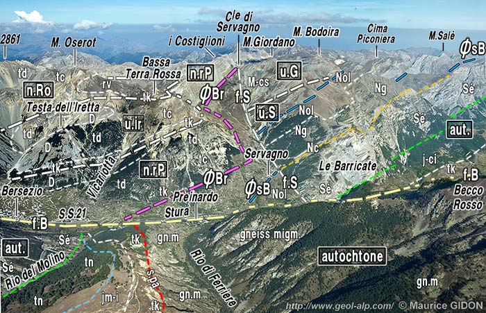 f.Be = faille de Bersezio ; f.An = faille de l'Andelplan ; f.sG = faille de la Fontana San Giovani ; f.rRE = faille est du Rio Roburent ; f.rRw = faille ouest du Rio Roburent.