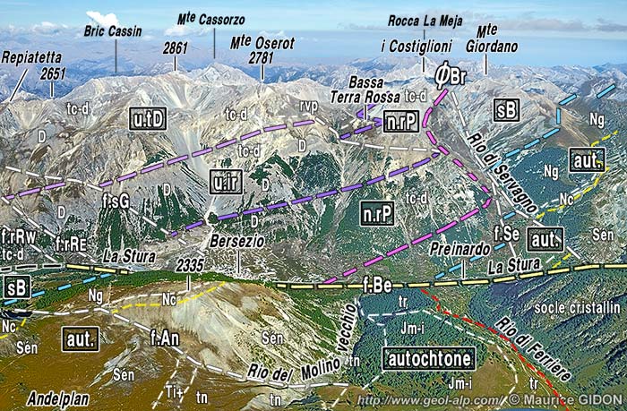 ; n.rP = Nappe de Rocca Peroni ; u.G = Unité (subbriançonnaise) du Giordano ; u.S = unité (subbriançonnaise) de Servagno ; aut = Autochtone.