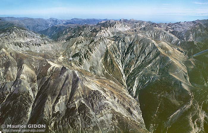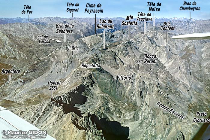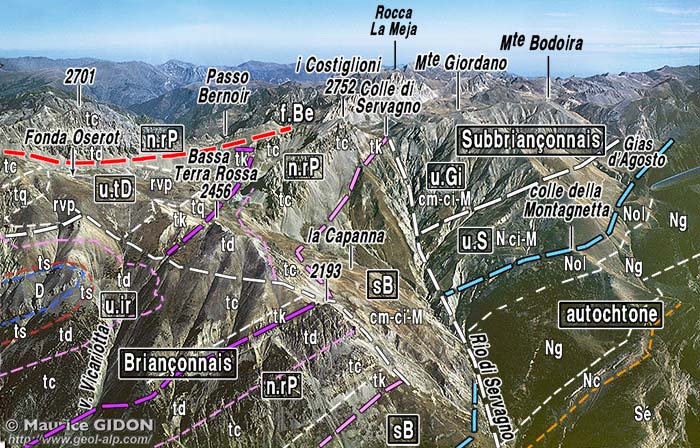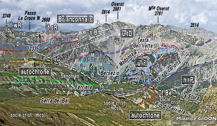 Au SE de Bersezio et des crêtes de l'Oserot l'empilement des unités briançonnaises disparaît "dans le ciel" du fait de la montée, d'ouest en est, de toutes les surfaces de chevauchement pour faire place sur le versant Stura aux unités subbriançonnaises empilées sur leur soubassement autochtone (plus de détails à la page "Giordano").