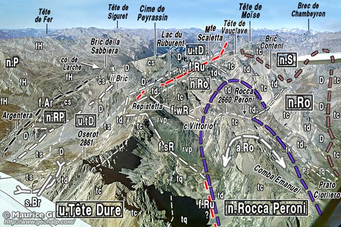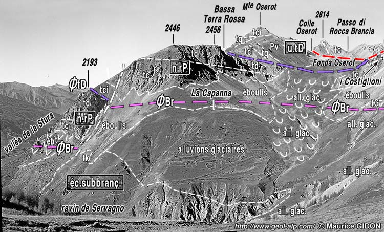 ØtD = surface de charriage de l'unité de Tête Dure (partie méridionale de la nappe du Rouchouse) ; n.rP = nappe de Rocca Peroni (partie la plus méridionale) ; ØBR = surface de charriage basale des nappes briançonnaises : les écailles subbriançonnaises les plus hautes sont masquées, sur ce versant, sous un épais placage glaciaire en partie affecté par d'anciennes coulées boueuses.