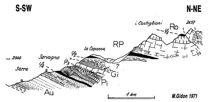 - le second est que ce sur-élèvement progressif des terrains de la rive sud-orientale de ce ravin a été encore renforcé par le jeu d'une cassure transversale, NE-SW, la faille de Servagno : elle fait partie d'une famille de cassures de même direction, à rejet cartographique sénestre, qui est représentée plus à l'est par plusieurs autres failles, telle celle du Gias, qui sont toutes postérieures au charriage car elles affectent à la fois socle et nappes.