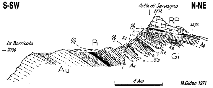 Coupe oblique au ravin de Servagno, en rive gauche pour sa moitié gauche et en rive droite pour sa moitié droite (extrait de la publication n° 059, M.GIDON 1972, présentation retouchée)