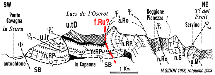 La pointe occidentale de ces affleurements se situe au Passo Peroni, lequel correspond à l'extrémité sud-orientale du tracé de la faille du Ruburent reconnu, sur le versant des lacs de ce nom. Or il n'est guère concevable, compte tenu de son rejet et de sa longue continuité, que cette grande cassure puisse s'amortir là. En ce cas les données de terrain imposent de considérer que cette faille du Ruburent doit se poursuivre en direction du SE, au prix d'un décalage dextre de son tracé par les failles de Repiatetta, pour se connecter, à l'est de la Colletta Vittorio, avec la surface verticale du chevauchement de la nappe du Rouchouse (ceci porte d'ailleurs à admettre que le fonctionnement de la faille du Ruburent l'a sans doute fait rejouer).