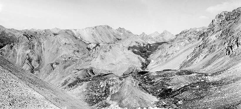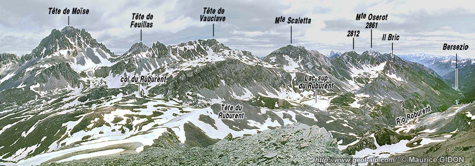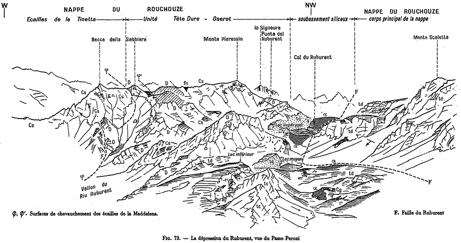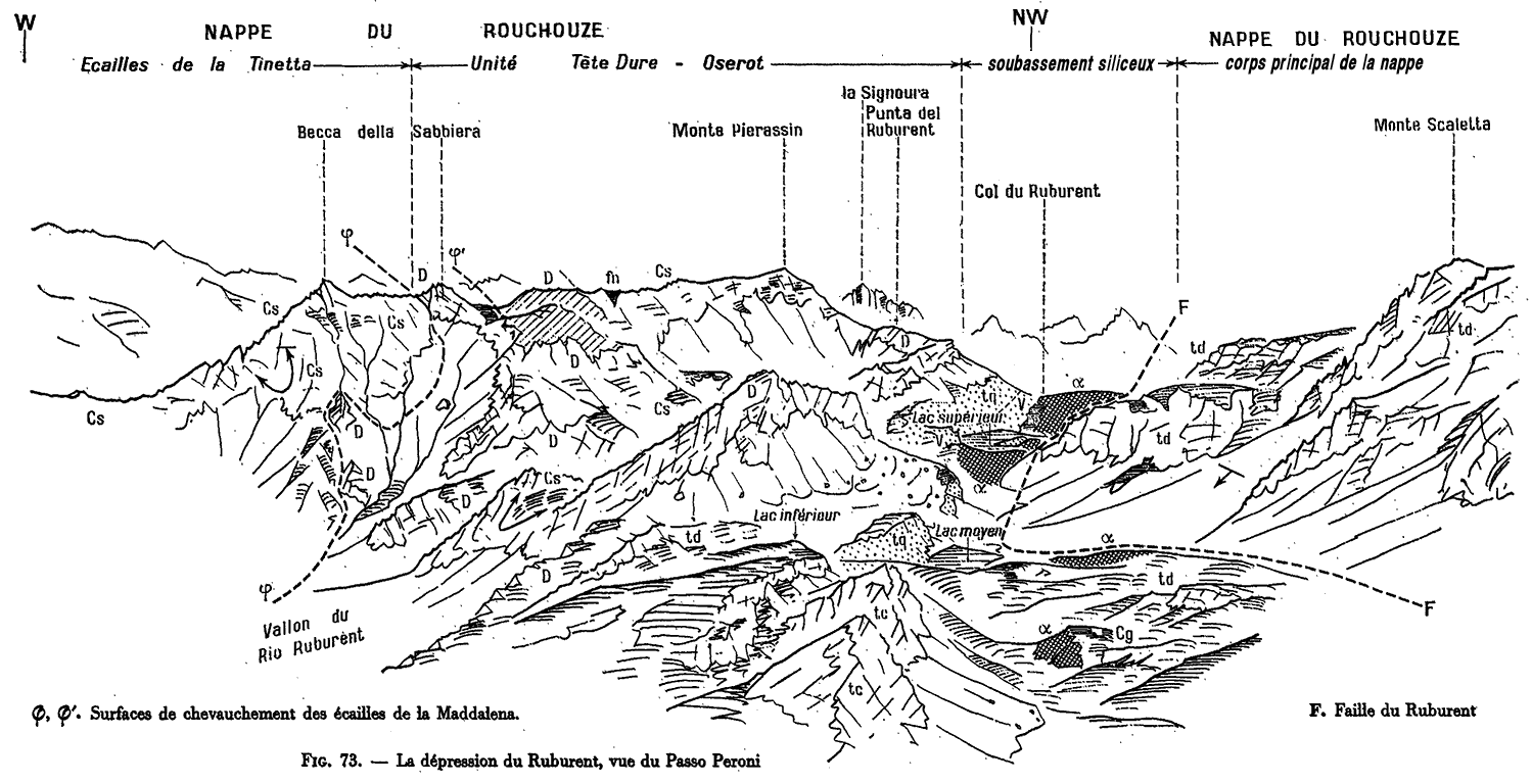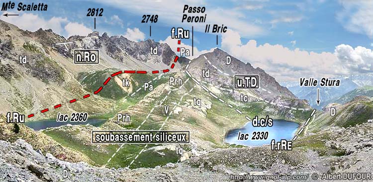 ![]() Les lacs du Ruburent inférieurs (sud-orientaux), vus du NW, depuis le Rocher 2530 (cliché original obligeamment communiqué par Mr. A. Dufour). n.Ro = corps principal de la nappe du Rouchouse (les plaques blanches sont des dalles structurales de bancs du niveau des dolomies claires ladiniennes : elles sont inclinées conformément au signe de pendage) ; f.Ru = faille du Ruburent ; u.TD = unité de tête Dure = partie occidentale de la nappe du Rouchouse (sa succession calcaire recouvre le soubassement siliceux par une surface de discordance d.c/s) ; f.rRE = faille orientale du Rio Roburent (voir son prolongement à la page "Argentera"). |