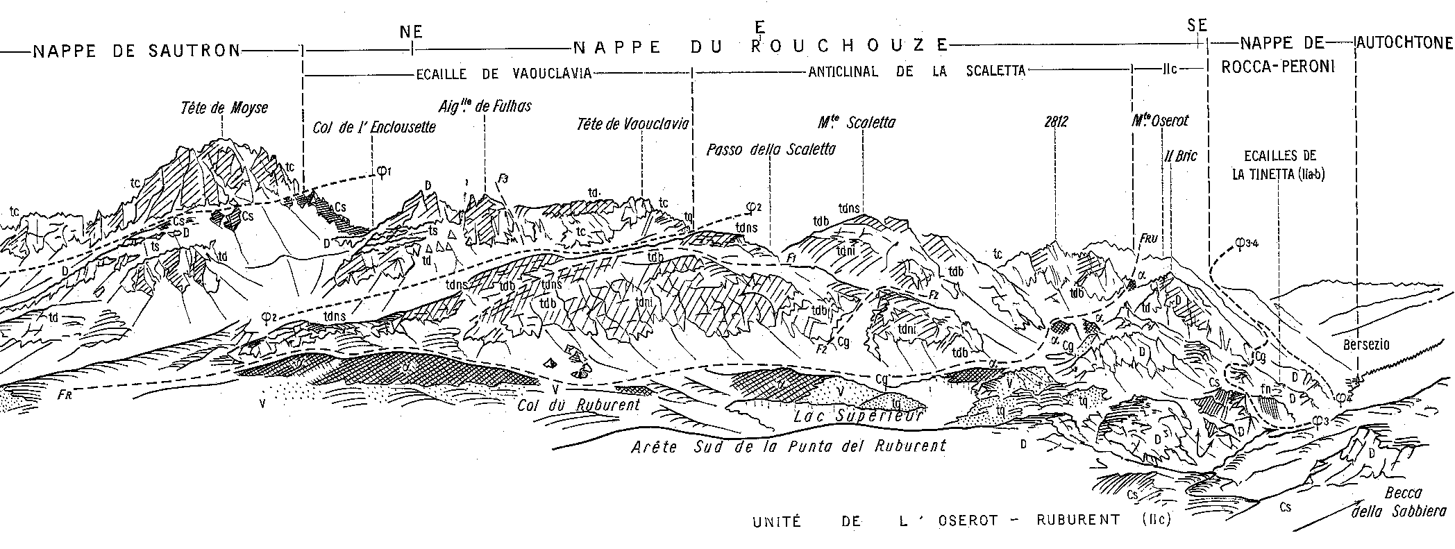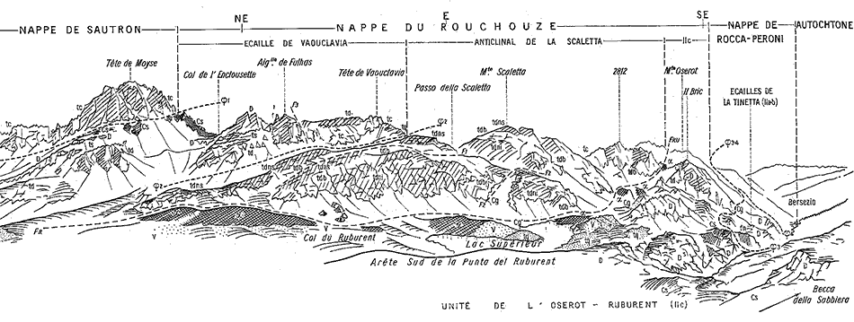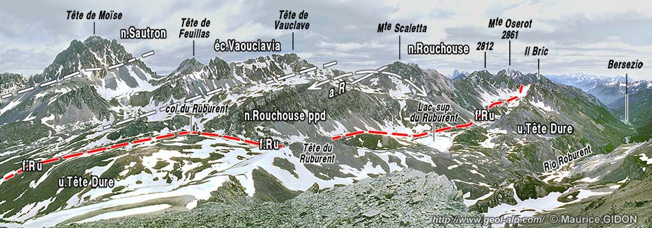 La partie du flanc sud-occidental du pli anticlinal, qui est séparée du corps principal de la nappe du Rouchouse par la faille du Ruburent, constitue l'"unité de Tête Dure". Elle forme les crêtes de rive droite de l'Ubayette depuis la Viraysse, au nord-ouest (voir la page "Rouchouse") et se prolonge vers le SE au delà du Bric, jusqu'au Monte Oserot. Son appartenance à la nappe du Rouchouse est une interprétation qui s'accorde avec le sens du rejet de la faille du Ruburent (voir la page "Rochers de Saint-Ours") et que confirme la coupe naturelle donnée par la transversale du Monte Oserot (voir la page "Oserot"). |