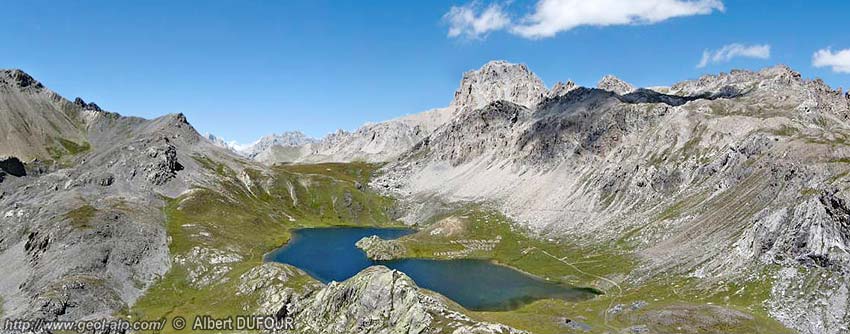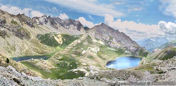Sur la transversale des lacs les couches calcaires de l'unité de Tête Dure ne forment pas un chaînon saillant comme de part et d'autre, à la Tête du Ruburent, à l'ouest, et au Bric à l'est. Elles y ont été fortement déblayées par les torrents affluents du Rio Roburent, qui descendent vers la vallée de la Stura et ne subsistent plus guère en saillie qu'en formant les pitons 2474 et 2530 sur la crête séparant le lac inférieur des deux autres, plus élevés.
