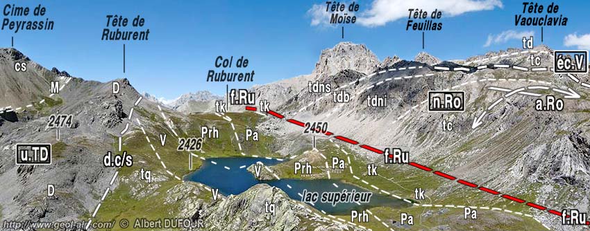 La faille du Ruburent (F) surélève, du côté gauche (SW), les terrains de la semelle siliceuse de l'unité de Tête Dure (rattachée à la nappe du Rouchouse) : elle est de ce fait soulignée par un alignement d'affleurements d'andésites permiennes (lettre grecque "alpha").