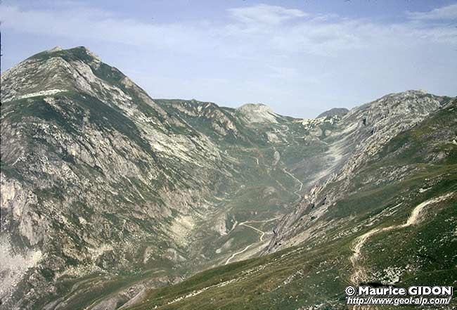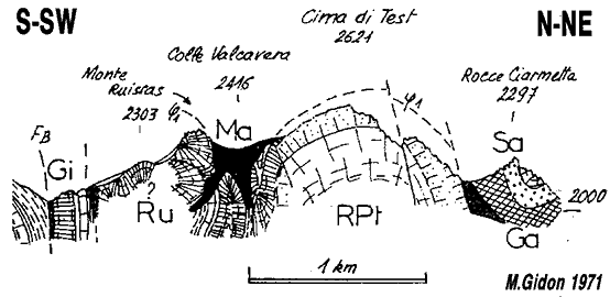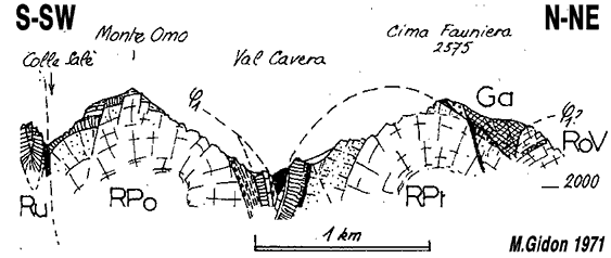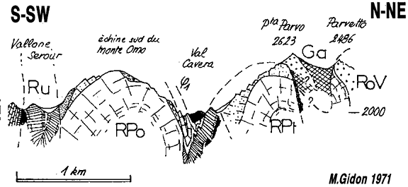 Coupe sur la transversale du colle Valcavera (extrait de la publication n° 059, M.GIDON 1972, présentation retouchée)