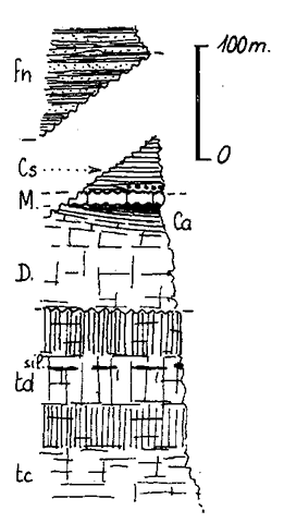 Colonne stratigraphique de l'unité de l'Omo : Abréviations : fn, Faciès « flysch noir », cs, Faciès calcschistes du Crétacé supérieur et de l'Éocène (br : brèches de niveaux divers) ; cm, Crétacé moyen ; ci, Néocomien ; M, Faciès calcaire du sommet du Malm (sil. : niveaux à silex) ; Ar, Calcaires argileux « argoviens », tn, Faciès « terres noires » (Oxfordien), Ca, « Callovien » ; D, Barre calcaire du Dogger ; Sin., Sinémurien (?) ; Het., Hettangien (?) ; Rh, Rhétien ; tk, Cargneules triasiques ; ts, Schistes, brèches et dolomies « postladiniennes » ; td, Dolomies ladiniennes ; tc, Calcaires anisiens. |