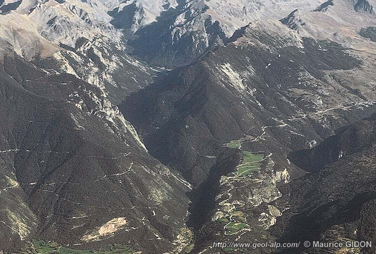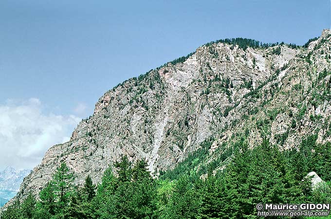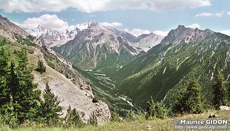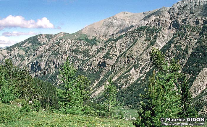 ![]() Coupe transversale au val d'Escreins peu au nord des ruines du village d'Escreins (orientation inverse de celle du cliché ci-dessus) |