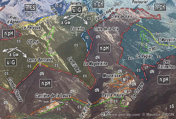 - Du côté occidental du vallon la nappe de Peyre Haute forme toute la partie supérieure de la crête de Vars (voir la page "Crête de Vars"). Elle y affleure d'ailleurs de plus en plus largement vers le nord et n'y est plus séparée de l'unité inférieure du Guil que par des lames tectoniques, de plus en plus effilées vers le nord, qui représentent la terminaison septentrionale de la nappe du Châtelet (voir la planche de coupes). Les derniers témoins de cette nappe disparaissent même totalement à l'extrémité de la crête, dans les pentes de la Magdeleine, en rive gauche comme en rive droite des gorges, de sorte que les dolomies noriennes de Peyre Haute reposent directement sur les brèches de la Magdeleine crétacées.