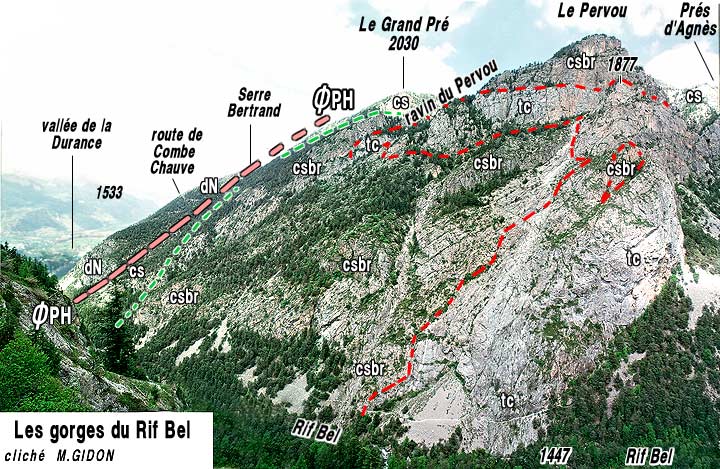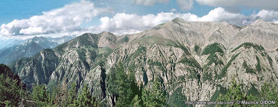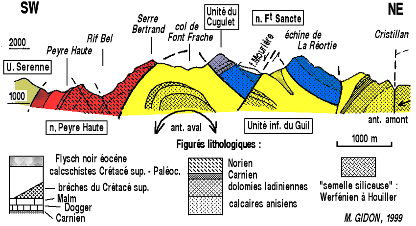 ![]() Coupe de l'extrémité méridionale de la fenêtre aval du Guil peu au nord du sommet de Cugulet (débouché aval des gorges du Rif Bel) |