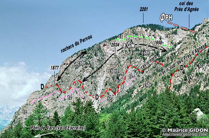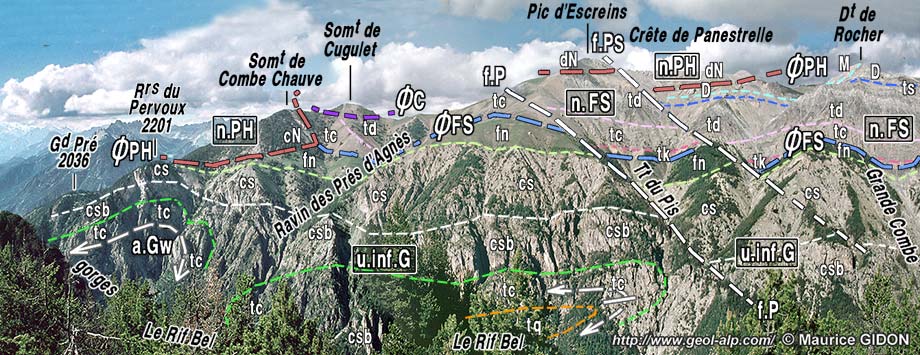 ![]() La rive droite de la vallée d'Escreins, en aval du hameau, vue du Col de la Scie (crête de rive gauche). ØPH = chevauchement de la nappe de Peyre Haute ; ØFS = chevauchement de la nappe de la Font-Sancte ; f.P = faille des Pelouses (et du torrent du Pis) ; f.Ps = faille sud des Pelouses ; ØC = chevauchement de l'unité du Cugulet. Les brèches (csb) de la partie inférieure des marbres en plaquettes (cs) reposent directement (par une surface de discordance) sur les calcaires triasiques de l'anticlinal occidental du Guil (a.Gw). En rive septentrionale du Torrent du Pis ces couches dessinent une charnière secondaire, plus orientale, qui est fortement déversée vers l'Est. Voir la suite vers la droite de ce panorama aux pages "Dent de Rocher" et "Haut Rif Bel". |
