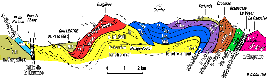 ![]() Coupe schématique de la totalité des gorges du Guil Les couleurs individualisent les différentes nappes superposées , dont on voit qu'elles ont été reployées ensemble. Des notations en abrégé indiquent les principaux niveaux stratigraphiques. NB 1 : L'interprétation qui voudrait que le synclinal des Ourgières soit un rebroussement dû à un chevauchement tardif des nappes du flanc oriental de l'anticlinal aval du Guil est incompatible avec le fait que, en rive gauche du Guil (au Pic d'escreins), la nappe de Peyre Haute repose en chapeau sur celle de la Font-Sancte. NB 2 : Les replis dessinés, entre Guillestre et Plan de Phasy, dans matériel briançonnais invisible sous les alluvions le sont de façon purement symbolique pour tenir compte de ceux affectant les schistes de l'unité de Serenne ... |