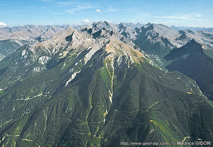 Le versant de rive gauche des gorges aval du Guil est très boisé, en raison de son exposition à l'ubac, et il comporte d'importants placages d'alluvions glaciaires jusqu'à plus de 1800 m d'altitude. Ceci constitue une gêne pour lire la structure de ses pentes, où l'on cherche évidemment, mais en définitive peu fructueusement, à retrouver la structure visible sur l'autre versant de la vallée.
