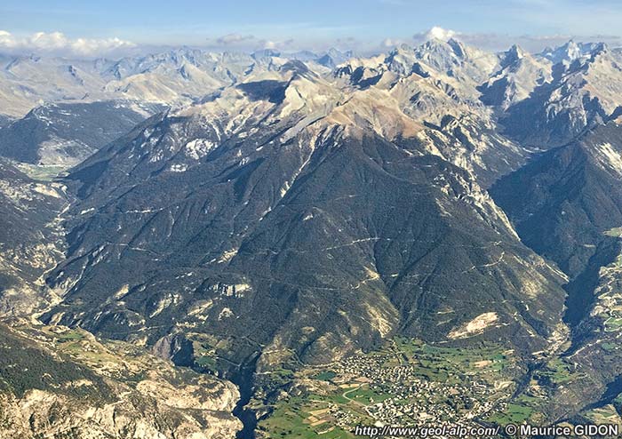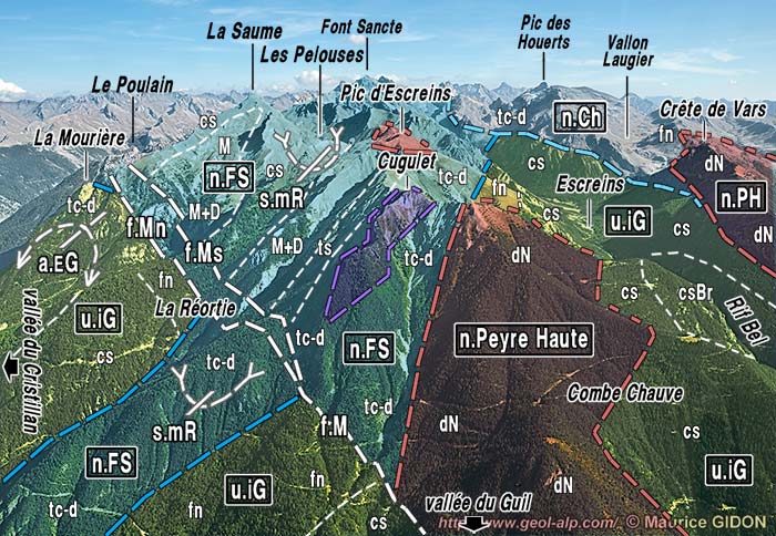 ![]() Le massif d'Escreins et les pentes supérieures de la rive gauche du Guil, vus du nord, d'avion (vue prise plus an amont des gorges que la précédente). u.iG = unité inférieure du Guil (surcharge jaune) ; n.FS = nappe de la Font-Sancte (surface de chevauchement en bleu et surcharge bleue) ; n.Ch = nappe du Châtelet (surface de chevauchement en bleu-pâle ; pas de surcharge) ; n.pH = nappe de Peyre Haute (surcharge rouge et surface de chevauchement en brun rouge) : il s'y rattache les klippes du Pic d'Escreins et des Houerts (angle supérieur droit du cliché) ; u.c = unité du Cugulet (contour en mauve). f.M = faille de la Mourière (f.Mn = branche nord ; f.Ms = branche sud) ; a.EG = anticlinal oriental du Guil (fenêtre du Cristillan) ; s.mR = synclinal de la Maison du Roi (son axe est décalé dans le sens sénestre par la faille de Mourière. tc-d = Trias moyen calcaréo-dolomitique ; dN = calcaires, brèches et dolomies noriens (sans distinctions) ; csBr = masse principale des brèches néocrétacées de La Madeleine. |
