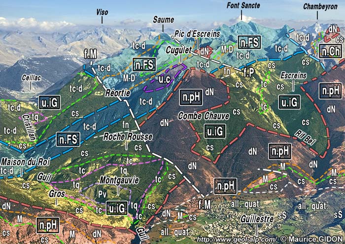 ![]() La rive méridionale (ubac) des Gorges aval du Guil, vue du nord-ouest, d'avion, de l'aplomb des pentes de Réotier. u.iG = unité inférieure du Guil (surcharge jaune) ; n.FS = nappe de la Font-Sancte (surface de chevauchement en bleu ; surcharge bleue) ; n.Ch = nappe du Châtelet (surface de chevauchement en bleu-pâle) ; n.pH = nappe de Peyre Haute (surcharge rouge et surface de chevauchement en brun rouge) : il s'y rattache les klippes du Pic d'Escreins et des Houerts (angle supérieur droit du cliché) ; u.c = unité du Cugulet (contour en mauve). - failles E-W, à compartiment droit (sud) abaissé : f.M = faille de la Mourière ; f.P = faille des Pelouses. Pv = Permien volcanique (rhyolites de Montgauvie) ; s.S = schistes de Serenne (nappe inférieure de l'Embrunais) ; all.quat. = alluvions glaciaires et cônes de déjections recouvrant la terrasse des conglomérats interglaciaires de Mont Dauphin. |