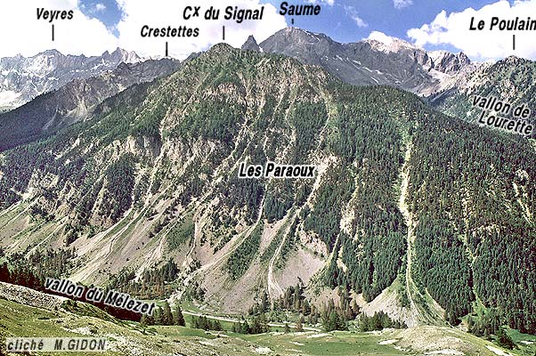 Le versant largement boisé qui s'étend au sud-ouest de Ceillac, entre la crête de la Saume et la basse vallée du Mélezet, héberge les deux vallons de Lourette et Charjouret, l'un et l'autre orientés NE-SW, qui sont encombrés d'éboulis et de glaciers rocheux*. Du côté aval ces vallons sont séparés de la vallée du Mélezet par le ressaut boisé des pentes inférieures de rive gauche de cette vallée. Ce trait de relief résulte de ce que l'érosion glaciaire, en approfondissant et en élargissant le vallon du Mélezet, a tranché le débouché de ses affluents de rive gauche : cela en a fait des vallons suspendus et cela a obligé, par la suite, leurs torrents à y creuser d'abruptes gorges de raccordement (celles-ci ont l'avantage touristique d'être favorables en hiver à la formation de cascades de glace ...).