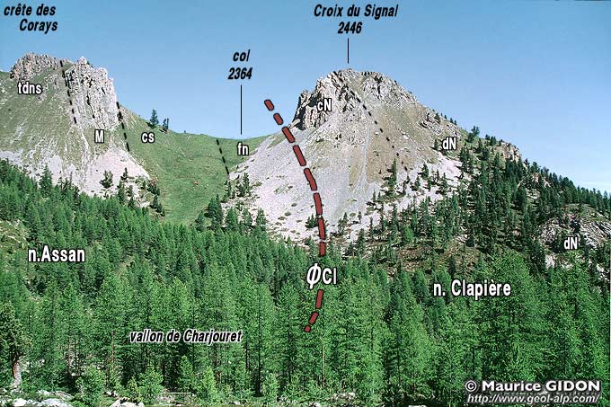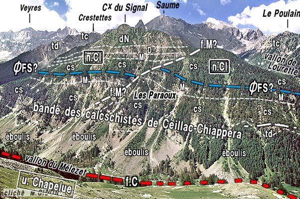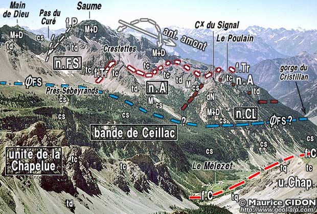![]() Le versant oriental de la Croix du Signal (= Croix du Mélezet) vu de l'est, depuis les pentes de Jalavez. N.Cl = nappe de la Clapière ; ØFS = surface de chevauchement rétroverse de la Font-Sancte, qui fait reposer les unités plus élevées sur la bande Ceillac - Chiapera ; f.C = faille de Ceillac ; f.M? = faille prolongeant peut-être la faille de la Mourière (voir la page "Mourière"). |