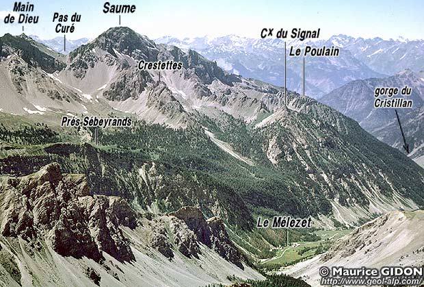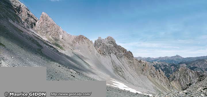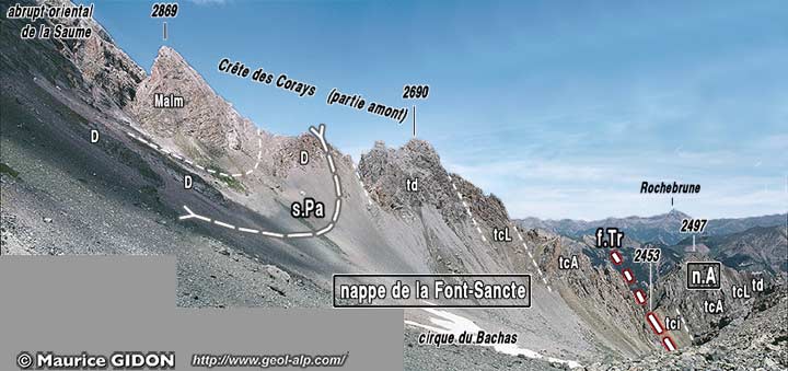 ![]() La partie amont de la crête des Corays , vue du sud, depuis la brèche 2650 de l'arête Mamelle - Crestette (versant est de la Saume). f.Tr = faille de la Traverse : surface d'affrontement, base contre base (polarité stratigraphique opposée), entre les couches de la nappe de la Font-Sancte et celles de la nappe d'Assan ; s.Pa = synclinal de la Partietta. |