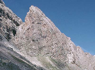Ces crêtes sont traversées presque orthogonalement par deux cassures sub-verticales qui séparent trois unités tectoniques distinctes. Mais il semble que ces deux cassures ne soient pas interprétables de la même façon :