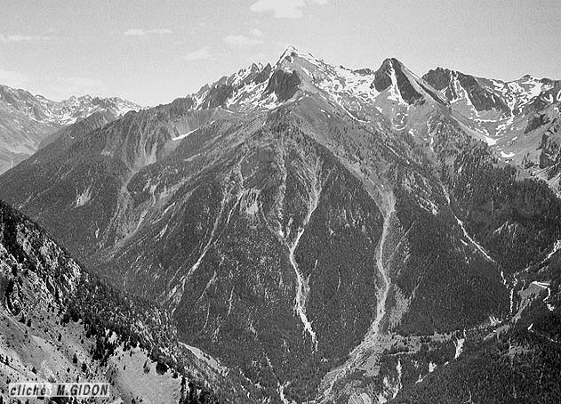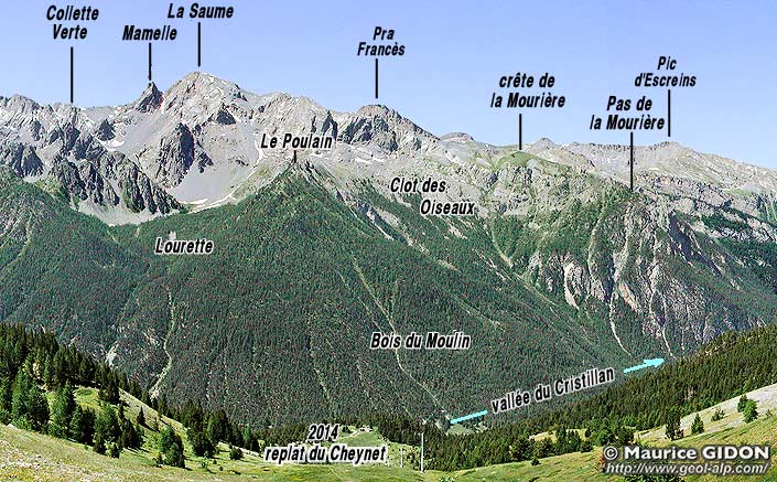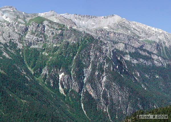 - Les pentes du versant oriental de la crête de la Mourière (pentes de rive gauche du vallon du Mélezet) montrent des couches dont le pendage devient de plus en plus vertical, voire renversé, du haut vers le bas. Ces pentes et les vallons transversaux qui les entaillent sont examinés à la page "Lourette".
