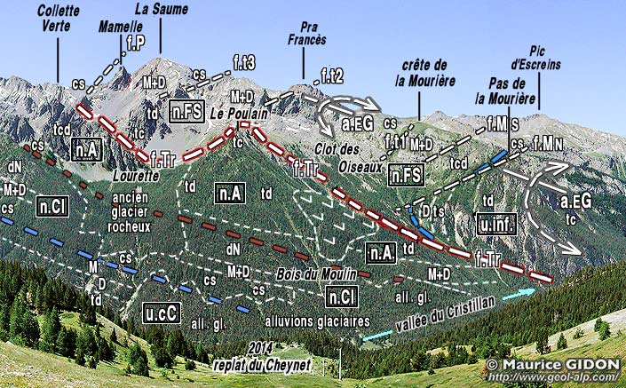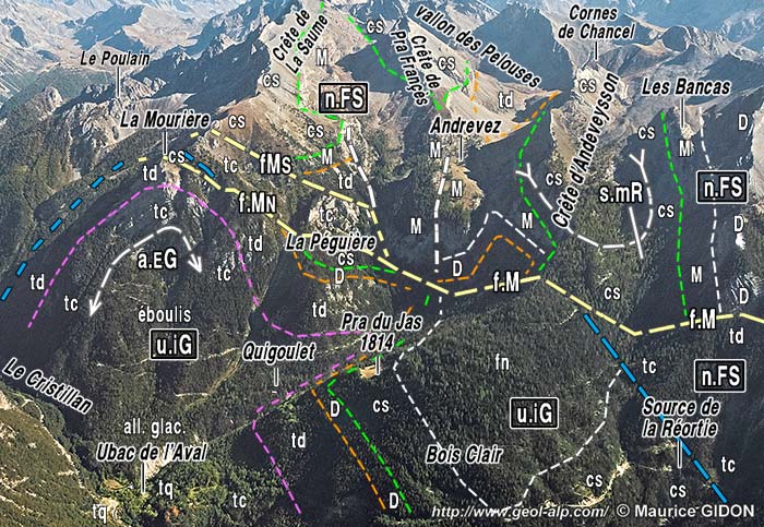 Toutefois les cassures transverses, notamment celle de La Mourière, doivent aussi y venir interférer et recouper les surfaces de charriage des unités tectoniques imbriquées (qu'elles doivent recouper et décaler), en même temps que ces dernières passent d'une attitude verticale à un renversement vers l'est (sous l'effet du rétrodéversement* de l'anticlinal oriental du Guil).