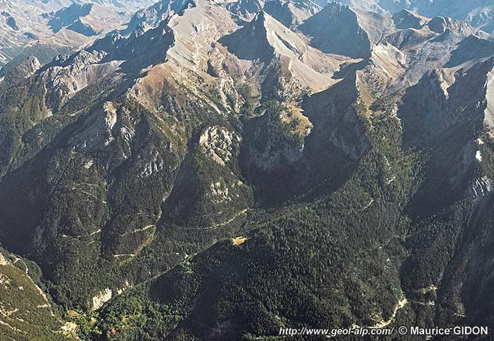 Le bas versant nord-oriental de la Saume devient boisé en dessous de 2400 m. Dans le secteur situé entre cette altitude et le fond de vallée il est difficile de déméler en détail l'organisation des ensembles rocheux, surtout en raison de son couvert forestier mais aussi du fait de sa complication tectonique.