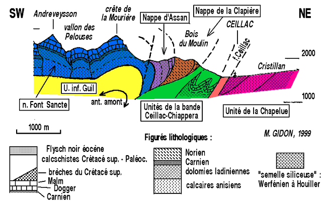 ![]() Coupe schématique de la marge orientale du massif d'Escreins à la latitude de Ceillac La faille subverticale qui abaisse la nappe d'Assan à l'est de la Mourière est sans doute le prolongement méridional de la faille de la Traverse de la rive septentrionale du Guil. |