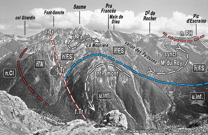 Cette cassure extensive est à peu près parallèle à celle, plus septentrionale, de la Mourière. Elle provoque, comme cette dernière, un abaissement de plusieurs centaines de mètres de son compartiment méridional. On constate, sur la crête du Pic d'Escreins, qu'elle affecte à la fois les deux nappes superposées de la Font-Sancte et de Peyre Haute. |