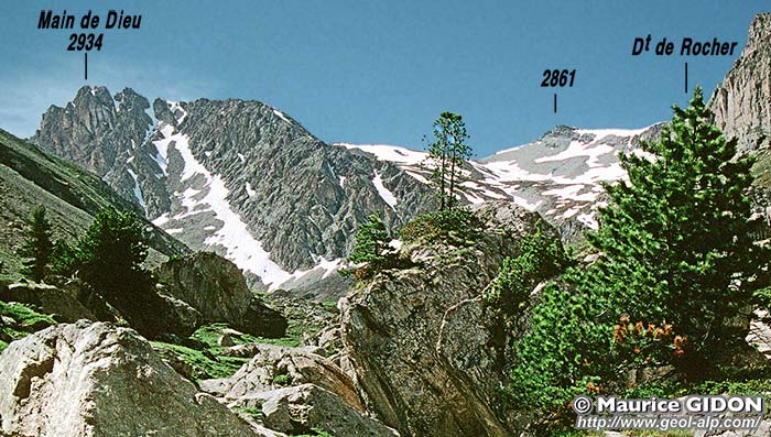![]() Les Rochers des Bancas vus du nord-est, depuis la partie basse du vallon d'Andreveysson. |