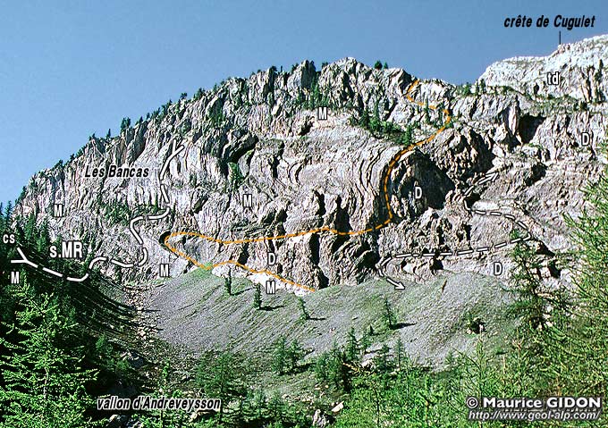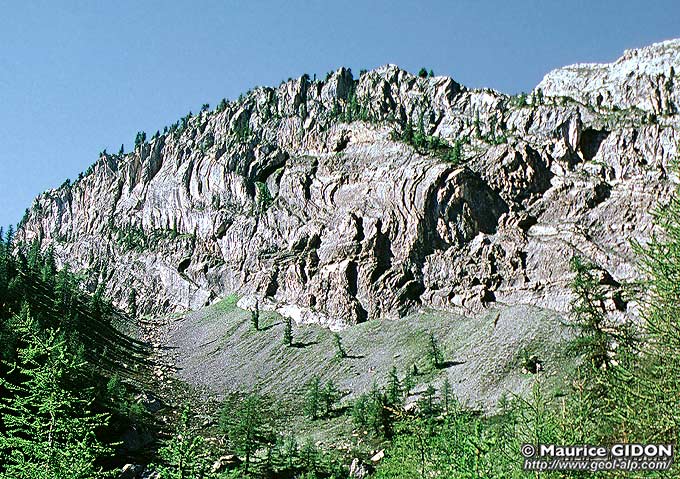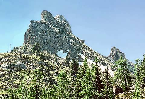 | Les cornes de Chancel vues du nord , depuis la crête d'Andreveysson On distingue sans peine la charnière synclinale déversée vers l'est (vers la gauche), dans les marbres en plaquettes de l'arête rocheuse. |