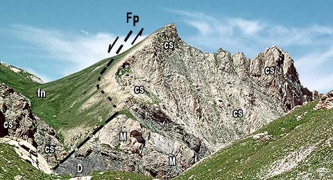altitude de 2550) FP = faille des Pelouses : la pente herbeuse du flanc sud de la plus haute corne correspond sensiblement à la surface de faille, dégagée par l'érosion, qui est vue pratiquement d'enfilade. Les affleurements de flysch noir marquent le coeur du synclinal de la Maison du Roy. L'affouillement de ces terrains tendres par l'érosion est évidemment la cause pour laquelle la crête se termine ici, du côté sud. |