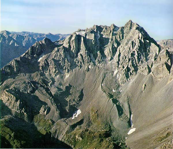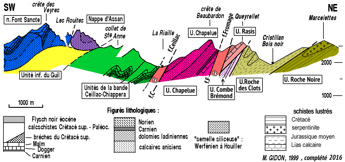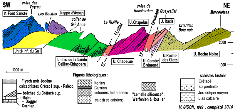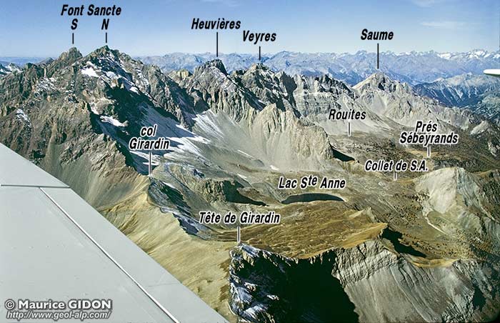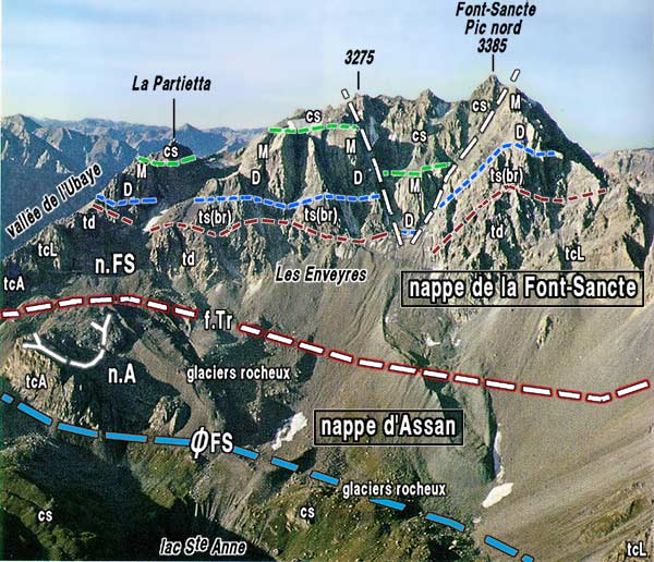 Toutes les deux montrent que les affleurements les plus orientaux de la nappe de la Font-Sancte sont rebroussés par un synclinal de la Partietta et qu'ils se juxtaposent au-delà, par une faille verticale, avec un compartiment où les couches triasiques dessinent un autre synclinal (tout en chevauchant sur les calcschistes du lac Sainte-Anne). C'est là une géométrie structurale tout-à-fait similaire que l'on observe, avec le synclinal des Crestettes, plus au NW dans le versant oriental de La Saume (voir le premier cliché de la présente page ainsi que les pages " "Prés Sébeyrands" et "Lourette") : cette similitude conduit à attribuer à la nappe d'Assan ces affleurements extrêmes des crêtes rocheuses orientales de la Font-Sancte : en fait ce sont les témoins le plus méridionaux de cette nappe, qui disparaît là "dans le ciel" vers le sud-est.