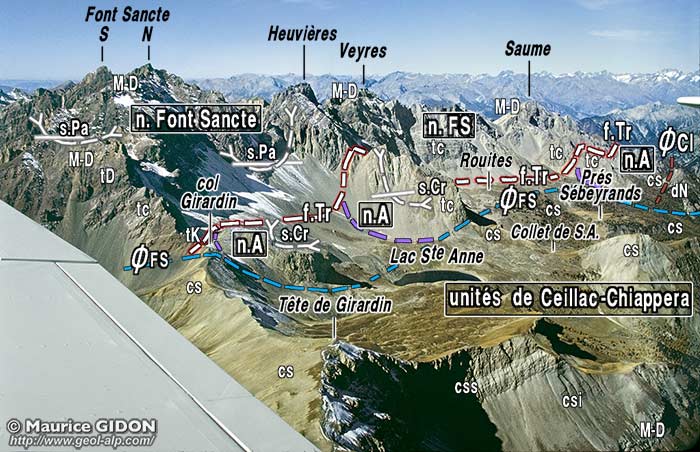 ![]() Le lac Sainte-Anne dans son environnement, vu d'avion, depuis le SE (à l'aplomb de Maurin, en Ubaye) n.FS = nappe de la Font-Sancte ; n.A = nappe d'Assan (klippes les plus méridionales de cette dernière) ; f.Tr = faille de la Traverse ; ØCl = chevauchement de la nappe de la Clapière ; ØFS = surface de rétro-chevauchement (elle sectionne les autres surfaces tectoniques) des unités calcaires (et notamment de celle de la Font-Sancte) sur les calcschistes de Ceillac . s.Pa = synclinal de la Partietta (bord oriental de la nappe de la Font-Sancte) ; s.Cr = prolongement vers le sud du synclinal des Crestettes (voir page "Prés Sébeyrands"). Remarquer les rubanements de couleur dans les calcschistes de la bande des calcschistes de Ceillac (leur répétition permet d'y soupçonner de grands plis couchés). Les niveaux sombres, plus argileux (csi), représentent ici la partie inférieure de la succession du Crétacé supérieur- Éocène. |