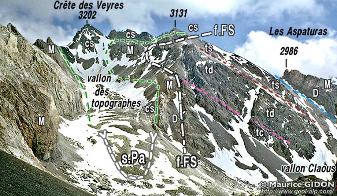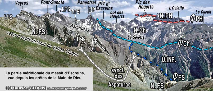 ![]() Bloc perpectif schématique des chaînons situés au nord-ouest de la Font-Sancte, vu du NW dans l'axe des plis. FFS, FRB et FP sont les failles extensives anciennes (FFS = faille de la Font-Sancte, FRB = faille du haut Rif Bel, FP = faille de Panestrel). n.A (grisés) = nappe d'Assan ; n. FS = nappe de la Font-Sancte ; n. Ch = nappe du Châtelet L'axe du synclinal des Aspaturas passe par le sommet du Pic de Panestrel. Le sommet nord de la Font-Sancte est formé de calcschistes néocrétacés qui forment le coeur d'un "synclinal de la Partietta", dont le Pic des Heuvières représente le flanc nord-oriental. (ces plis sont représentés, mais non dénommés ici). |