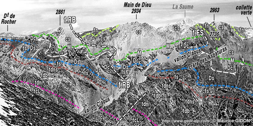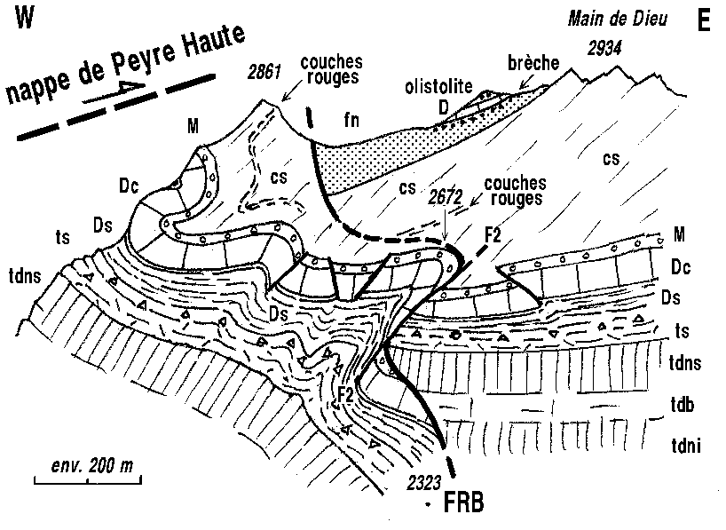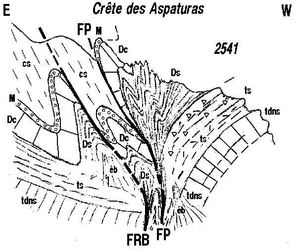 ![]() Croquis de détail du coeur du synclinal des Aspaturas, vu du vallon Claous. FRB = faille du Haut Rif Bel ; FP = faille de Panestrel. Les plis serrés du Jurassique sont dûs à un écrasement transversal intervenu bien après le jeu des failles : leur déversement vers l'est (vers la gauche) suggère qu'ils sont contemporains des rétrocharriages. |