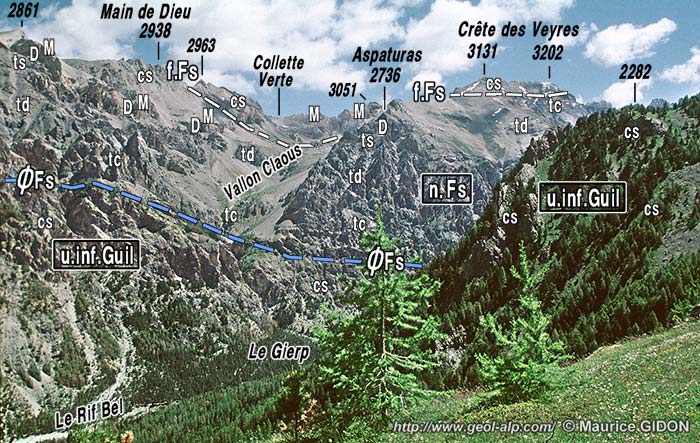 Le débouché aval du Vallon Claous dans le vallon du Rif Bel. Ø.Fs = nappe de la Font-Sancte ; f.Fs = faille de la Font-Sancte. |