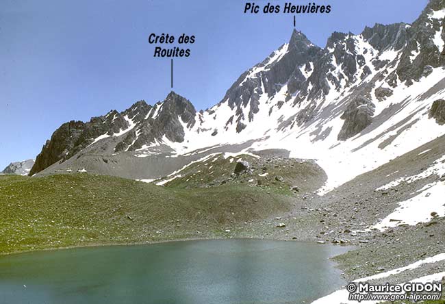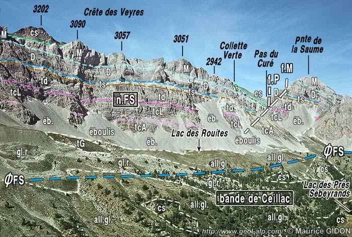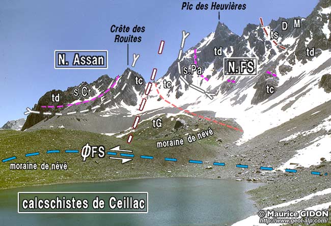 ![]() L'arête orientale des Heuvières et le lac des Rouites vus du nord depuis les basses pentes du Pas du Curé. Le ressaut qui soutient le lac est formé par les calcschistes néo-crétacés de la bande de Ceillac (voir la page "Prés Sébeyrands") mais, sur ses rives, ces couches sont masquées sous le cordon morainique qui retient les eaux. ØA = surface de chevauchement de la nappe d'Assan ; n.FS = nappe de la Font-Sancte ; ØR = surface de rétrocharriage ramenant la nappe d'Assan vers l'est, sur la zone de Ceillac s.Cr = synclinal des Crestettes ; s.Pa = synclinal de la Partietta. |